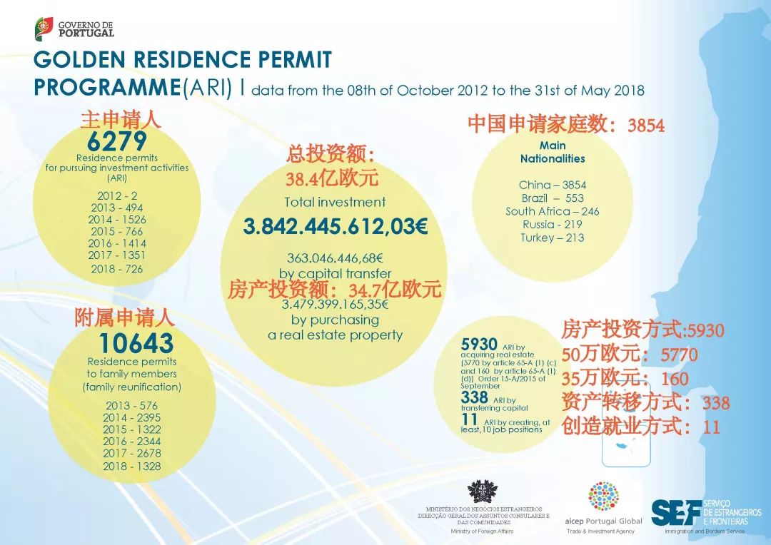 葡萄牙移民局(SEF)官方发布了截止到2018年5月31日黄金居留获批的最新数据。(1)累计投资额:目前为止,葡萄牙黄金居留许可项目总投资额约为38.42亿欧元,其中房地产贡献约为34.79亿欧元。(2)主申获批人数:5月份有120位主申请人获批,累计总共6279位投资人成功获批黄金居留许可。(3)附属申请人数:5月份有247位附属申请人成功获批,黄金居留许可累计附属申请人数为10643人。(4)投资者来源:在目前6279位获批的投资者中,中国有3854人(占比约61%)。