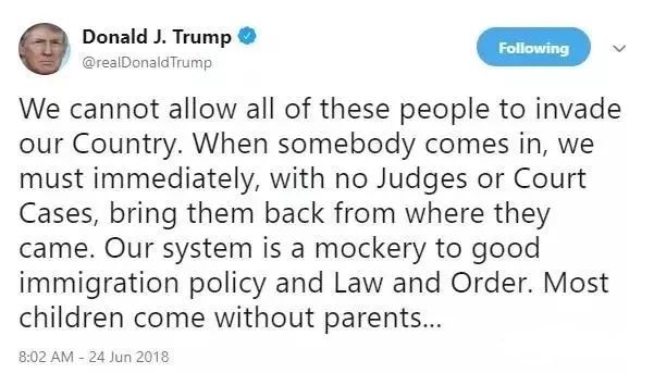 6月24日,特朗普拉高分贝连发两条推文,称非法移民为“入侵者”,现有的移民政策对那些正在等待排期的合法移民非常不公平!“我们不能让所有这些人入侵我们的国家,当有人非法入境时,我们必须立即在没有法官或法院审理的情况下,将他们从哪里来送哪里去。我们的体制是对好的移民政策和法律秩序的嘲弄。大多数过来的孩子都没在父母身边。”