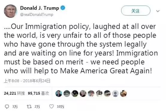接着,特朗普又发布了第二条推特继续说,“我们的移民政策,被全世界嘲笑,对那些合法地申请身份并且等待多年的所有人都是非常不公平的!移民必须基于优点,我们需要帮助美国再创辉煌的人!”