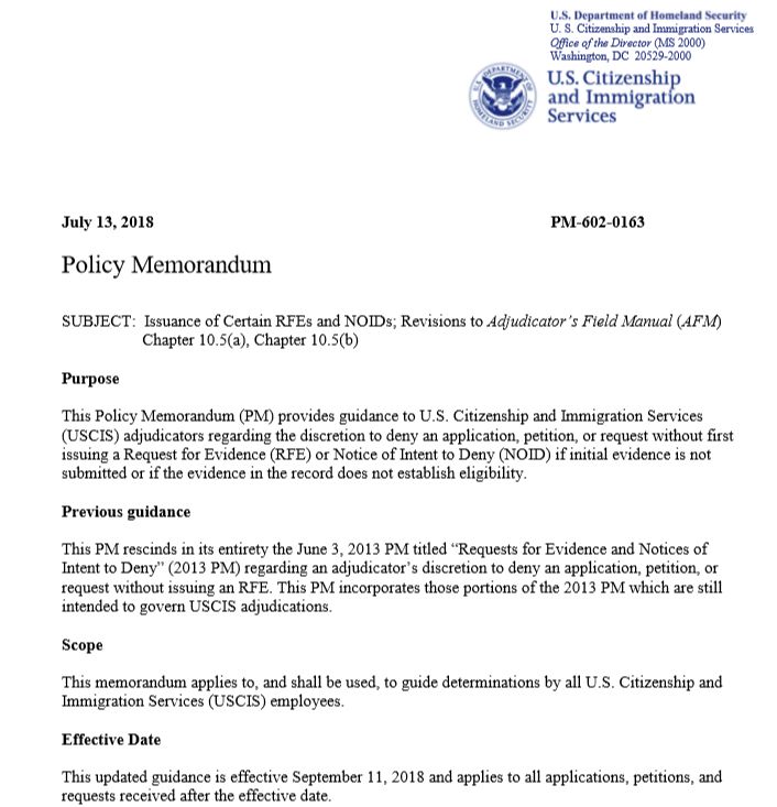 官提供指导的最新政策指南:从今年9月11日起,外国公民申请移民时如果没有提交全部证明文件或所提供材料不合要求,官员有权直接拒绝个案,不再向当事人发出“补件通知”(RFE)或“否决申请意向通知书”(NOID)。