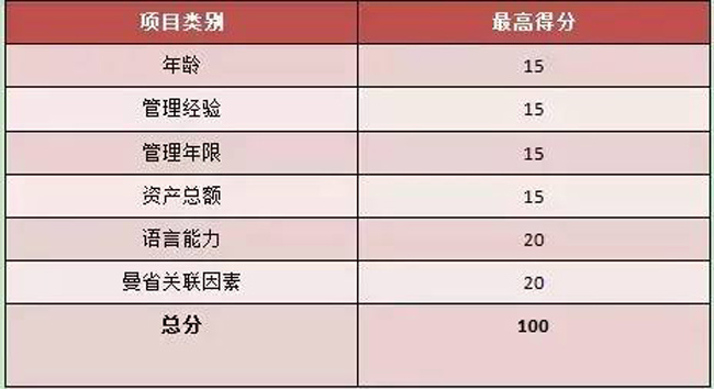 据悉,曼省投资移民如今采取打分制的形式,甄选合符资格的客户,并通过建立申请人数据库,系统性甄选数据库一周内分数最高的十位客户,进而发放邀请函、邀请客户递交投资移民申请。其评分制主要分为以下六大项,得分60分以上的客户,可把资料递交到数据库等待邀请。