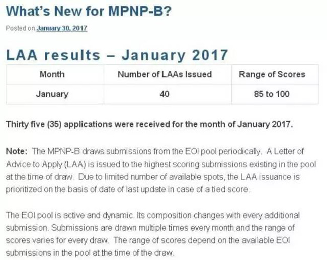 温哥华分公司提供的消息,加拿大曼省移民局日前公布了2017年1月份的EOI最新筛选情况:共发出40份LAA,最低85分,筛选分数范围是85-100分。