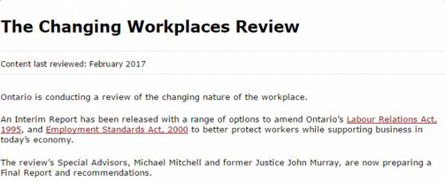 据加拿大的广播公司报道,由省府任命的两位特别的顾问已于两年前开始对安省的职场的法律改革提出建议。
