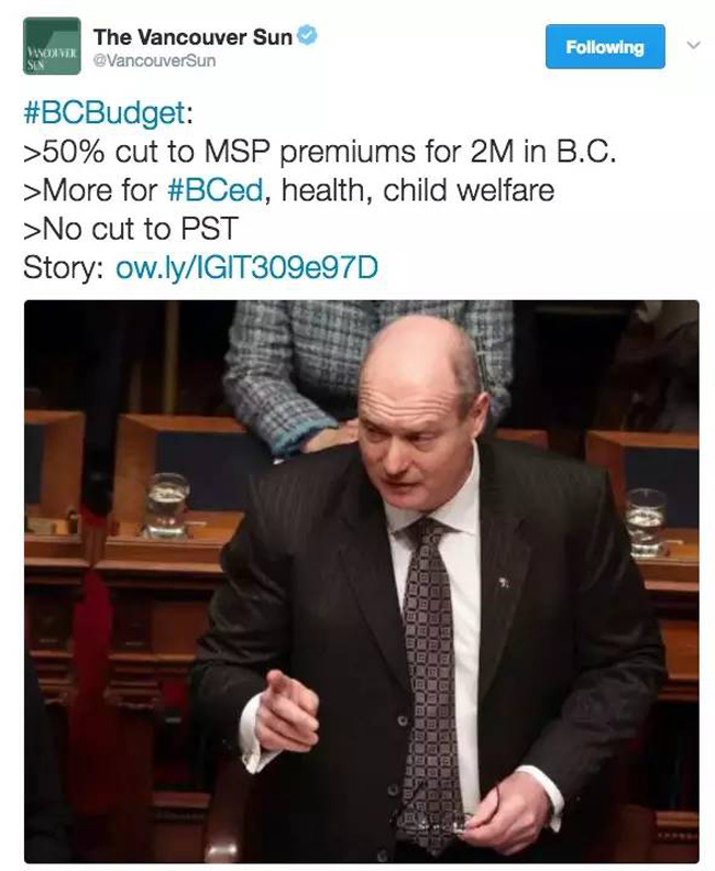 据悉,BC省财政厅长麦德庄在维多利亚议会大厦公布了2017-2018的年度财政预算,MSP供款减半、小企业减税、房屋买卖减税金额提高等,成为省民们关注的焦点。