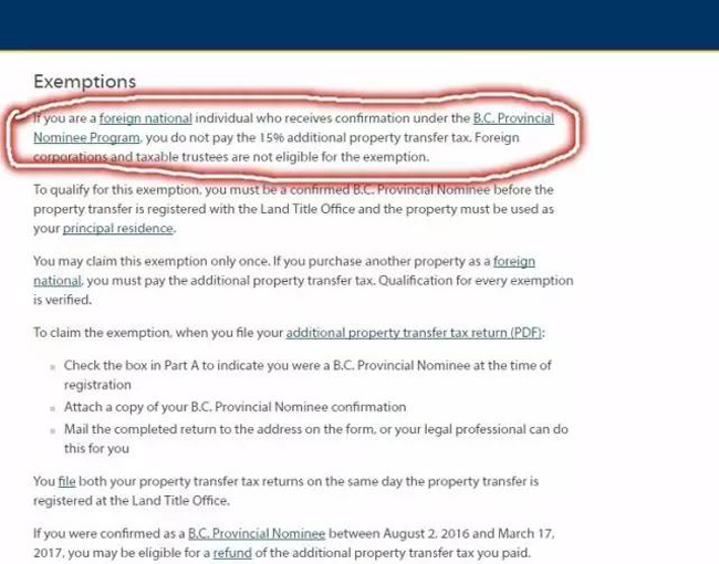 1.BC省PNP获得者,其所购置的住宅作为自住之用,那么这类人群就可以不需要再缴15%外国买家税,而在去年8月2日之后购房缴税的PNP提名者可申请税金退款。申请表格可在BC省政府网站上查阅。