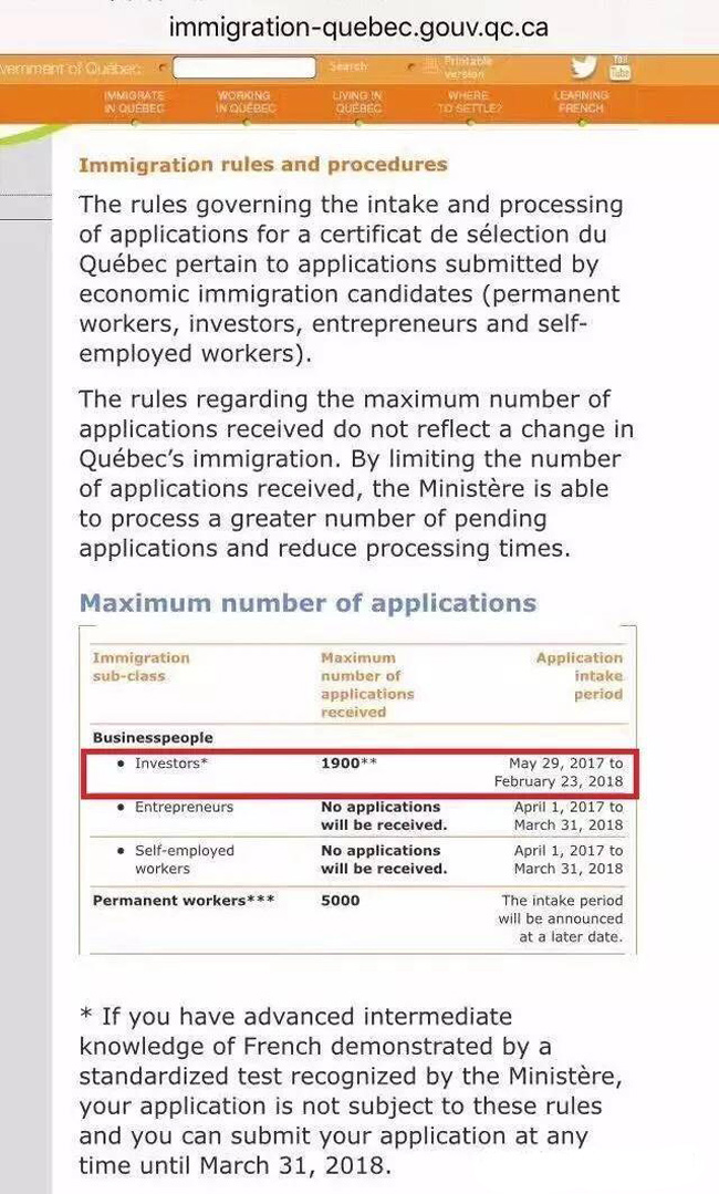 温哥华分公司收到最新消息,当地时间3月30日,加拿大魁省移民局在其官网公布了2017年-2018年魁省投资移民项目正式重启。项目开放申请时间为2017年5月29日至2018年2月23日,全球配额为1900个,其中中国申请人配额为1330个(包括香港和澳门地区)。