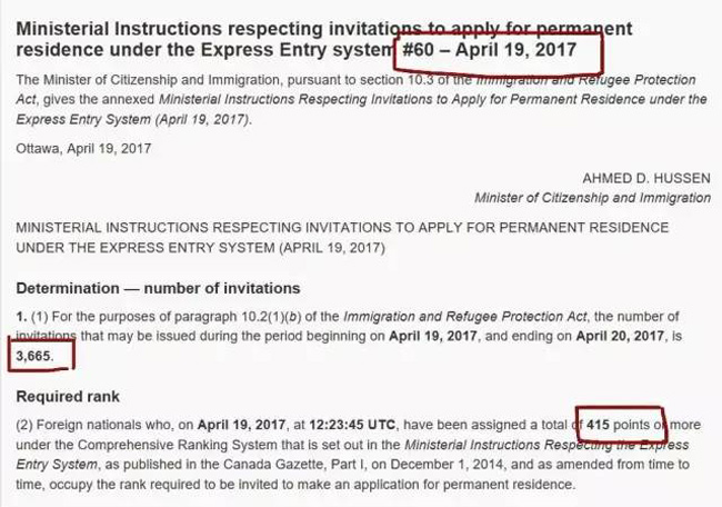 再来看看第60次Express Entry的筛选结果,简直让人目瞪口呆!自进入2017年以来,EE抽签分数一直都在大幅下降,这次更是跌破了420分大关,直降到415分。分数再次刷新最低纪录!
