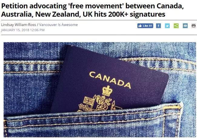 据多家英文媒体报道,非盈利组织CANZUK International发起的关于在加英澳新四国间人员自由流动的请愿书目前已经征集了20多万个签名。