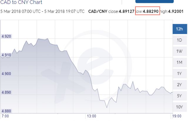 小编已经傻眼了!加元汇率今天又遭暴跌,不但跌穿¥4.90人民币关口,最低一度跌至¥4.88元人民币,创下2016年3月以来的最低点!
