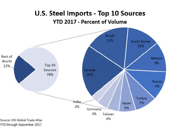 欧盟、中国和加拿大先后表态会采取报复行动,引发市场会潜在的全球贸易战的担忧,股市应声下跌。加拿大是美国钢铁和铝的最大来源国,2017年占总额16%。美国的关税决定可能对加拿大的伤害最大。