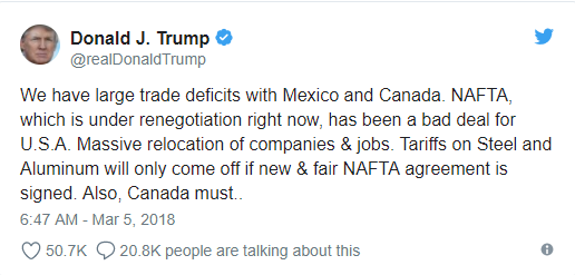 本周一,川普发出推文,威胁将北美自由贸易协定谈判(NAFTA)与钢铝关税挂勾,除非签署新的NAFTA协议,否则关税不会对加拿大网开一面。川普称:“我们与墨西哥和加拿大有巨大的贸易赤字。 目前正在重新谈判的北美自由贸易协定(NAFTA)对美国来说是一桩不利的交易……只有新签公平的NAFTA协议,钢铝关税才有可能豁免。”
