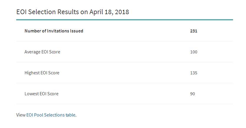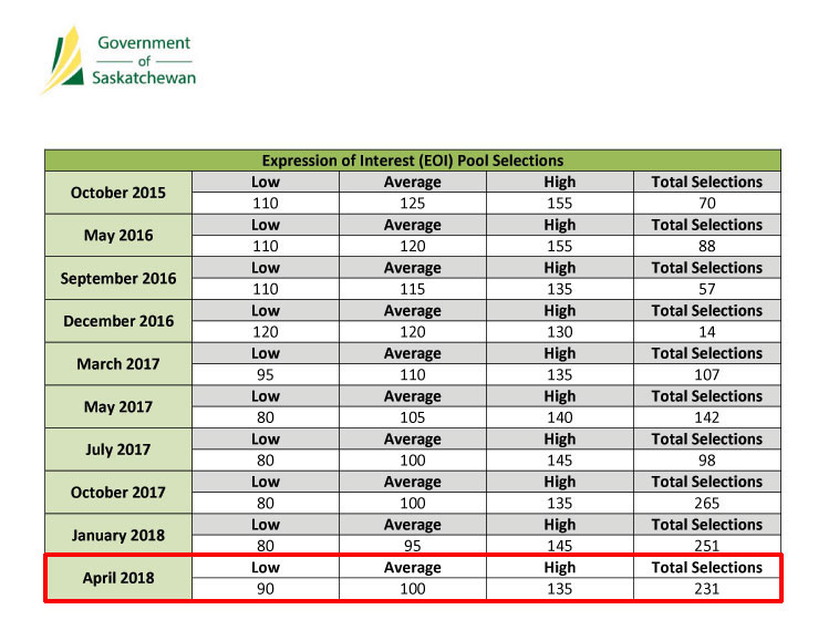 温哥华分公司提供的最新消息,当地时间4月18日,萨省移民局公布了2018年第二轮商业移民项目EOI筛选结果:最低分90分(提高10分),最高分135分(下降10分),平均分100分(提高5分),共计231位候选人(减少20人)获得邀请!