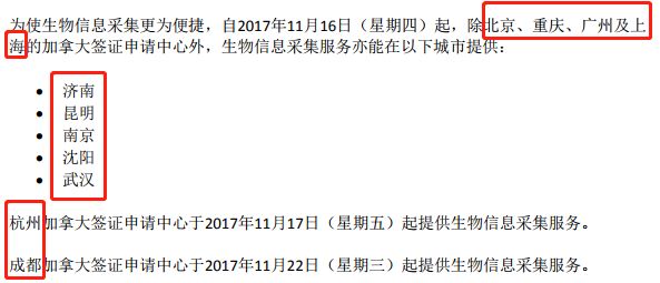 目前,加拿大在中国除原有的五个签证申请中心(北京、上海、香港、广州、重庆)以外,另有7个新的签证中心于2017年9月8日在成都、杭州、济南、昆明、南京、沈阳和武汉正式营业并在11月提供生物信息采集服务。截止目前,中国一共有12个加拿大签证中心,将来还会在中国设立更多的加拿大签证受理中心,申请人可以就近选择,办签会更便捷。