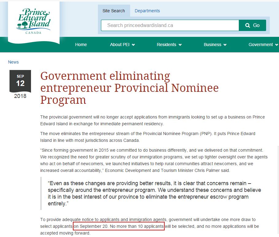 温哥华分公司收到最新消息,当地时间9月12日,PEI政府宣布永久关闭该省企业家移民计划!
