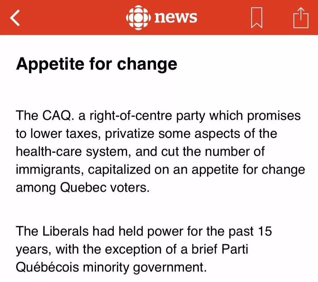 当地时间10月1日,加拿大魁北克省选落幕,民调领先的未来联盟党(CAQ党)在大选中胜出,取代了原先多数席位执政的自由党,组成多数政府。CAQ党领袖François Legault将成为新一任省长。