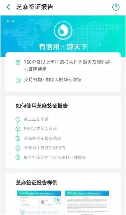 小编去看了看支付宝的芝麻信用,确实已经上线了这个功能,目前仅支持加拿大的签证办理,而且要求芝麻信用分在750分以上。点进去之后可以看到,这份签证报告是受加拿大驻华使领馆的支持。如果平时不经常使用支付宝,或者芝麻信用分没有达到750分,是无法生成签证报告的,只能和以前一样,提交银行的流水和资产证明。