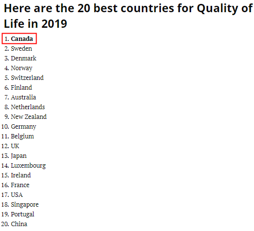 根据《美国新闻与世界报道》US News & World Report公布的最新报告,加拿大被评为综合排名第三的最佳国度,同时还获得2019年全世界国家生活质量榜单之首!(注:该排行榜是基于BAV Group和宾夕法尼亚大学沃顿商学院的调查,来自36个国家的20,300名参与者,根据65项不同指标给80个国家投票。)