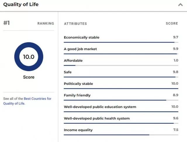 “生活质量”是基于一个国家生活质量相关的9个国家属性的平均得分平均值,包括负担得起、就业市场、经济稳定、家庭友好、收入平等、政治稳定、安全、良好发达的公共教育体系和完善的公共卫生体系。