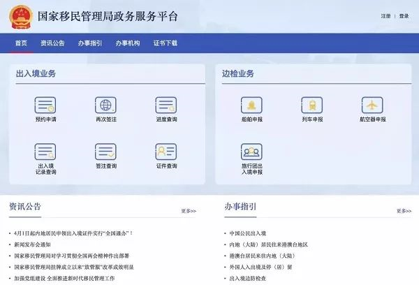 4月1日,“国家移民管理局政务服务平台”正式上线。该平台通过服务网站、国家移民管理局APP、第三方平台等方式,具备证件预约申请、往来港澳台旅游签注办理、证件进度查询、证件信息查询、出入境记录查询、办事指引查询等功能,可为群众提供24小时网上服务,真正实现“让数据多跑路、让群众少跑腿”。另外,该平台可向内地居民开放查询本人出入境记录和普通护照签发记录服务,同时可生成经国家移民管理局电子签名的电子文件。