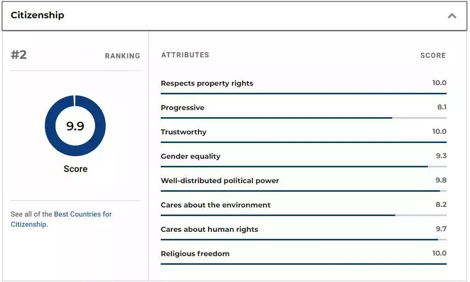 加拿大在公民权排名中,获得了全球第二名的成绩。公民权由多个部分组成,分别是:尊重财产权程度、发展进步程度、社会信用程度、性别平等程度、政治权利均衡性、环境关心程度、人权重视程度、宗教自由程度。在这八项评分中,加拿大均取得非常高的评价。