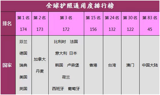 位居第一列队的国家免签全球174个国家和地区,包括芬兰,德国,瑞典,美国和英国。成为全球含金量最高的“金牌护照”。香港排名15,可免签通行156个国家和地区。台湾位居24,免签132个国家。澳门排名第30,免签122个国家。