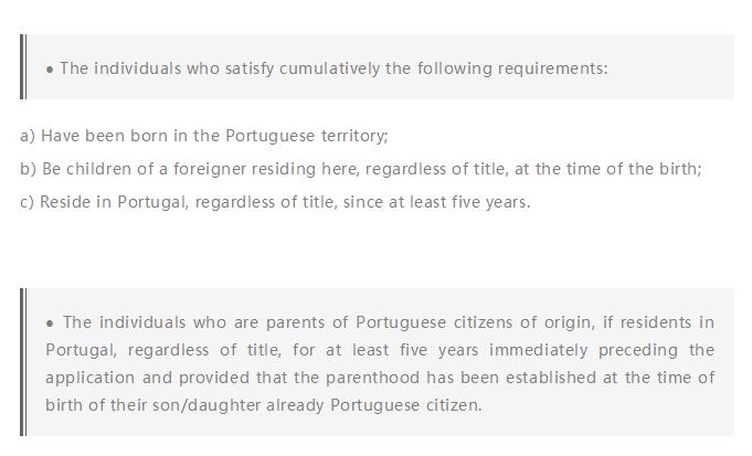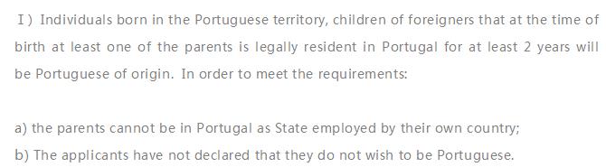 1.在葡萄牙境内出生的个人,为外国人子女的,父母有一方在葡萄牙合法居住至少2年,将成为葡萄牙公民。 并满足以下要求: