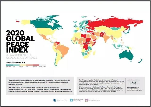 全球和平指数是由国际独立智库经济与和平研究所发布,2020年报告是该指数的第14版最新发布,对全球163个国家和地区(覆盖全球99.7%人口)的23项评价指标进行综合分析排序。