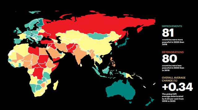 2020全球和平指数对163个国家和地区进行了分类评估,涵盖了世界99.7%的人口。