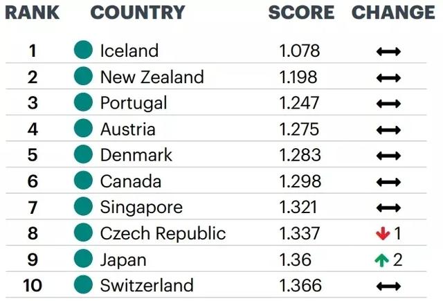 排名前10的国家分别是:冰岛、新西兰、葡萄牙、奥地利、丹麦、加拿大、新加坡、捷克、日本、瑞士。