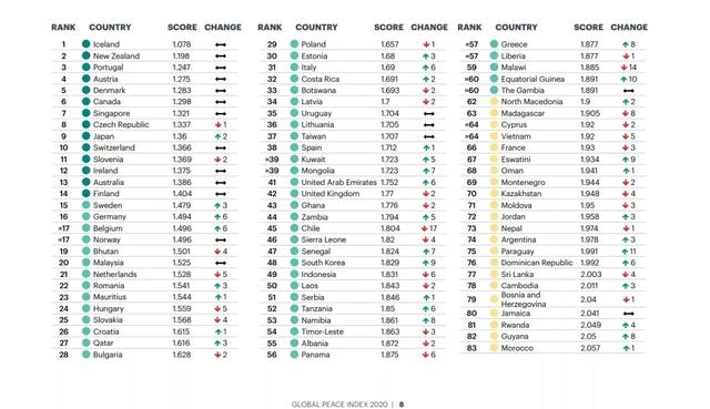 在这份2020年的排行榜上,葡萄牙的排名和得分与去年相同(1.247分),仅次于冰岛和新西兰,成为世界上最和平的国家之一。
