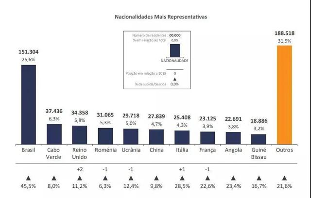 中国人排在第6,有27,839名中国人获得居留证居住在葡萄牙,占比4.7%。虽然占比不高,但绝对数也已接近3万人,2019年增幅较上一年度增长9.8%。