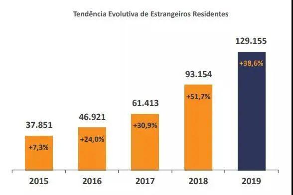 葡萄牙新外国人居民数量出现持续增加的趋势。2019年新增外国人居民达129,155名,较2018年同比大涨38.7%,与2017年相比新增人数实现翻倍(110.3%)。