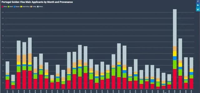 葡萄牙黄金签证各国申请人数据对比(每月)