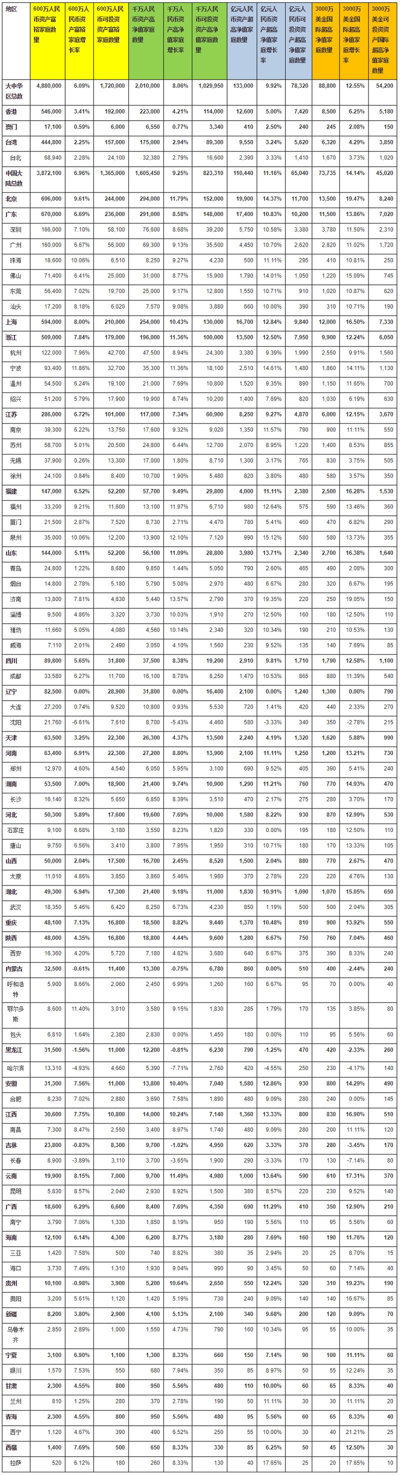 浙江第四,亿元资产超高净值家庭比上年增加1,500户,达到13,500户,增幅12.5%,其中拥有亿元可投资资产的超高净值家庭数量有7,950户。