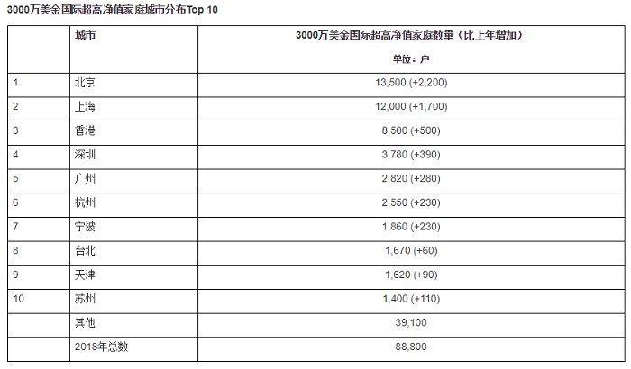 北京继续成为拥有最多3000万美金国际超高净值家庭的地区,比上年增加2,200户,达到13,500户,增幅19.5%,其中拥有3000万美金可投资资产的国际超高净值家庭数量有8,240户。