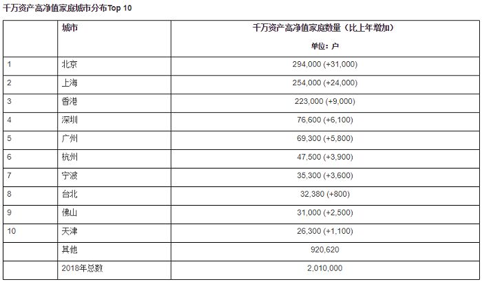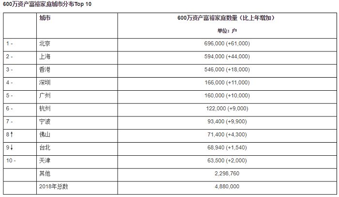 北京依然是拥有最多600万资产富裕家庭的地区,比上年增加6.1万,达到69.6万,增幅9.6%,其中拥有600万可投资资产的富裕家庭数量有24.4万。