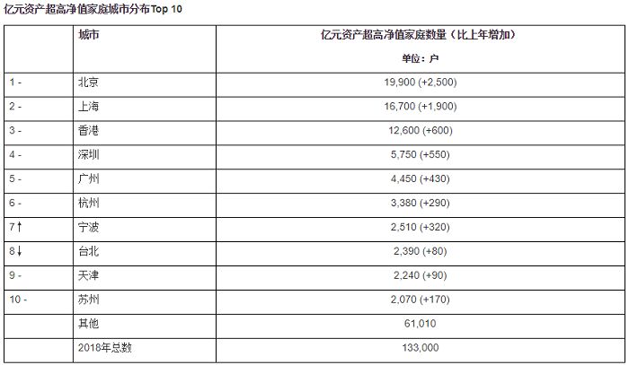 北京仍然是拥有最多亿元资产超高净值家庭的地区,比上年增加2,500户,达到19,900户,增幅14.4%,其中拥有亿元可投资资产的超高净值家庭数量有11,700户。