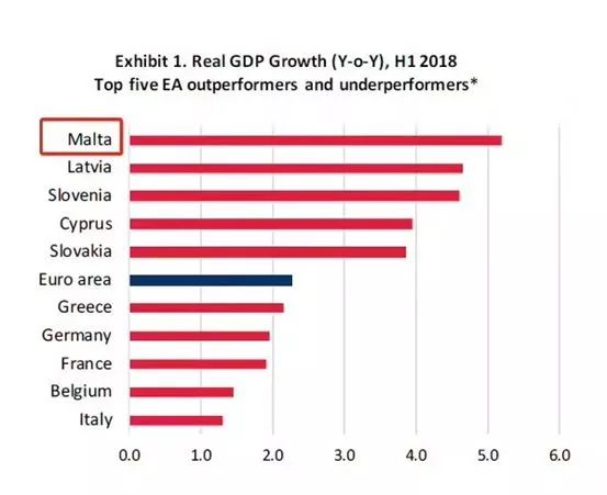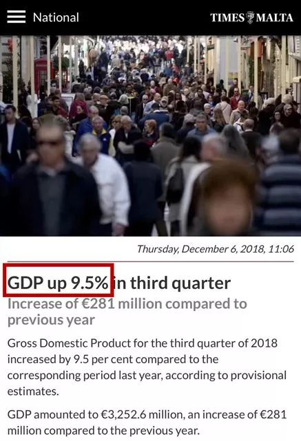 •经济增长迅猛,第三季度GDP增幅达到9.5%。马耳他的经济涨幅近年来可谓是惊人,2016年为6.4%,位居欧盟第二;2017年6.6%位居欧盟第三;而2018年更是有了9.5%的惊人涨幅。