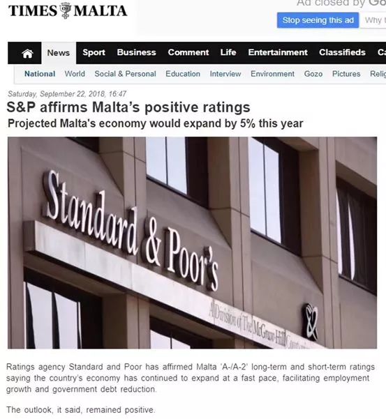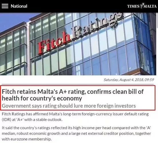 标准普尔将马耳他国债上调至A3,DBRS评级中马耳他在欧元区里GDP增速第一名,惠誉国际A+。