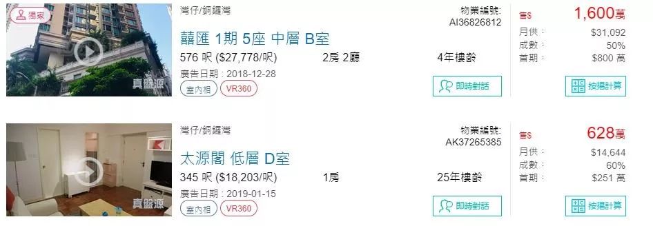 以第一套来看,大概57平米,售价高达1600万港币,约合人民币1377万,每平米售价大概24万人民币!贷款的话,按照香港30年期房贷2.375的利率,首付50%,月供也高达3万1港币。第二套价格比第一套低一点,但是房龄比较老。房价如此之高,怪不得香港人为买房那么拼。