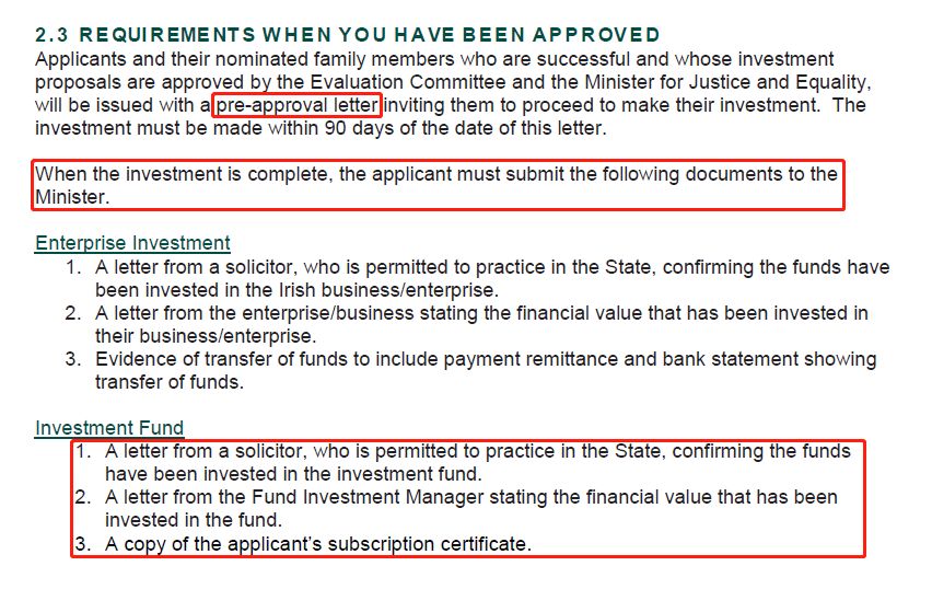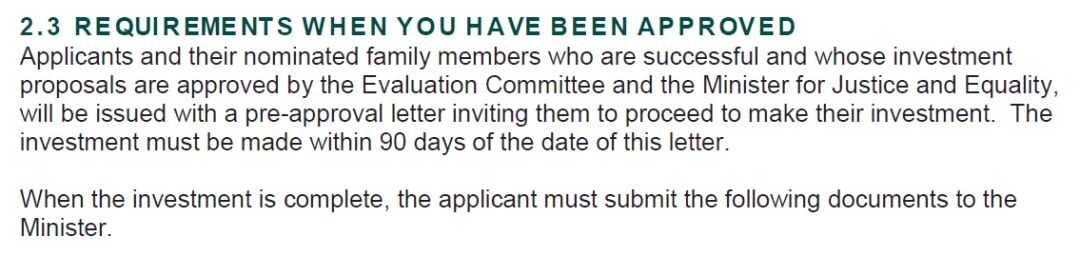 除了再次重申不得融资以外,此次法案更新还首次提到了“预批复”环节,即投资人的投资申请由评估委员会和爱尔兰司法和平等部长批准后将获得“预批函”。