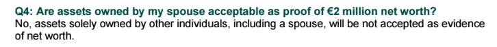 新法案中明确表示,除主申请人外,其他个人(包括配偶)独有的资产将不被接受作为200万欧元净值的证明,除非夫妻双方共同持有。