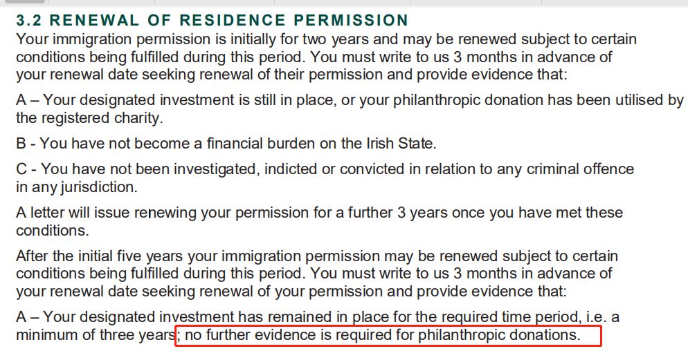 新法案中明确指出捐赠移民的申请人在转5年长期居留许可时无需提供证据。除此之外,还特别表明,居留许可的更新应在居留许可到期前3个月致函司法部来申请更新。更新时只需满足以下条件:指定的投资在规定的时间内保持不变,即至少三年;慈善捐赠不需要进一步的证据;没有成为爱尔兰国家的经济负担。