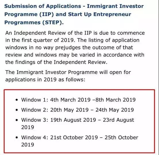 2019年IIP申请递交窗口期,全年共有四次递交窗口期: