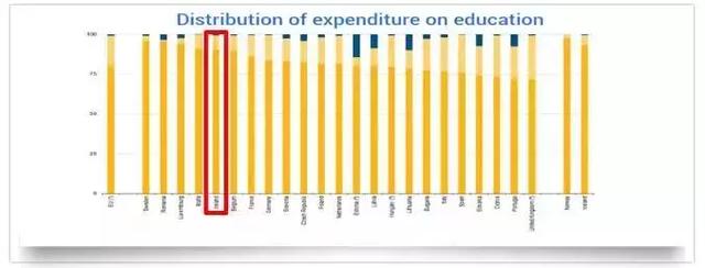 在欧盟统计局(Eurostat)2017年发布的欧盟国家在教育支出板块、政府、非教育机构及国际组织对教育支出的占比中,爱尔兰政府对教育的支出比例高居欧盟第五位。