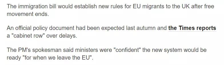 脱欧后,新的移民法案将会针对欧盟人士进入英国建立一个新的系统。针对此法案的一份官方文件本应该于去年秋季发布,但是由于效率低下的内阁程序,被严重滞后。首相发言人称,首相对于脱欧时新移民系统的准备工作非常有信心。