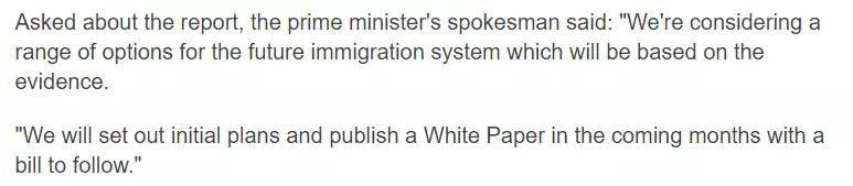 当在被问及这份报告时,首相的发言人说:“我们正在考虑对未来移民体系的一系列选择方案,这将基于证据。”“我们将制定初步计划,并在接下来的几个月内发布白皮书,并提交法案。”