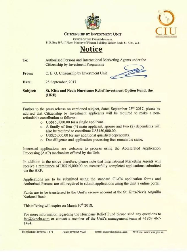 圣基茨政府近期推出一类“飓风抗灾基金”,在原有糖业基金标准基础上,将1-4人(含4人)申请,投资金额由原单人25万美金、全家30万美金降低至只需15万美金。超过4人以上的申请,每增加一人,增加2.5万美金。其他费用,包含背调费,表格费,护照费,公民证明费用不变。单人立省10万美金,全家立省15万美金!注意:有效期为6个月,即至2018年3月底止!一直关注圣基茨和尼维斯黄金护照的客户朋友们,可要把握机会了。