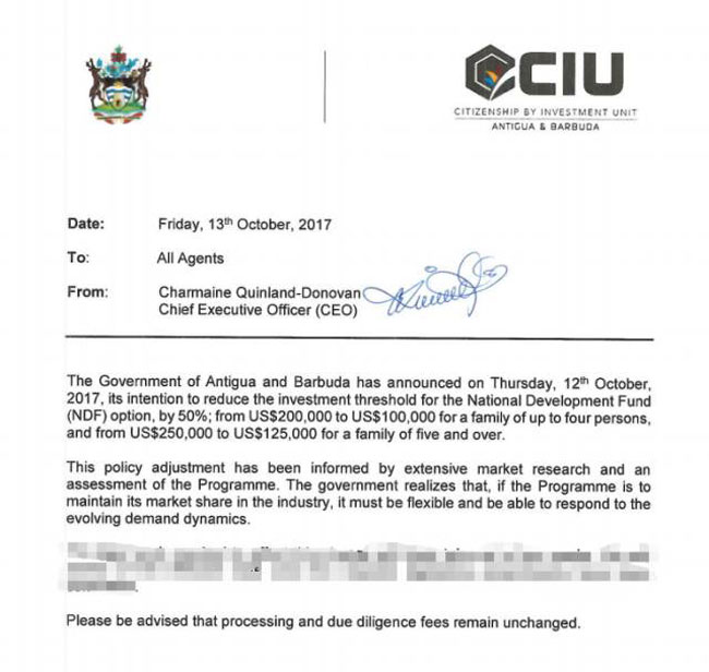 重磅消息!又有一本黄金护照要降价啦,而且还是史上最低价!安提瓜和巴布达政府近日宣布,受飓风灾害影响,计划要将“国家发展基金”(NDF)的捐献金额下调 50%。这是继2017年8月1日大幅降低政府申请费后,安提瓜投资移民的第二次大幅降价钜惠!