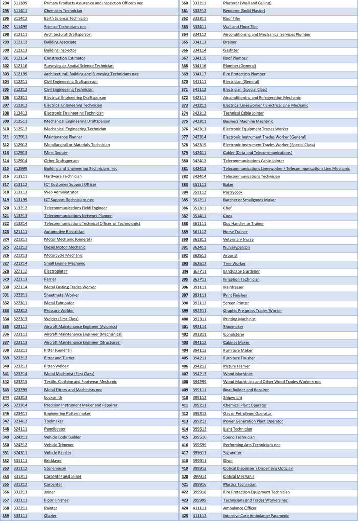 CSOL职业清单不仅包括了传统的IT、工程、医疗、教育和贸易等热门行业,还新增了多个短期和偏远地区的职位,拓宽了技术工人移民的机会。例如: